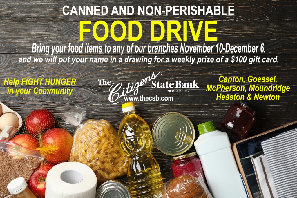 Stop by any branch location at The Citizens State Bank and for every five canned food or non-perishable food items, your name will be entered into a drawing for a weekly $100 Visa gift card (four cards total).